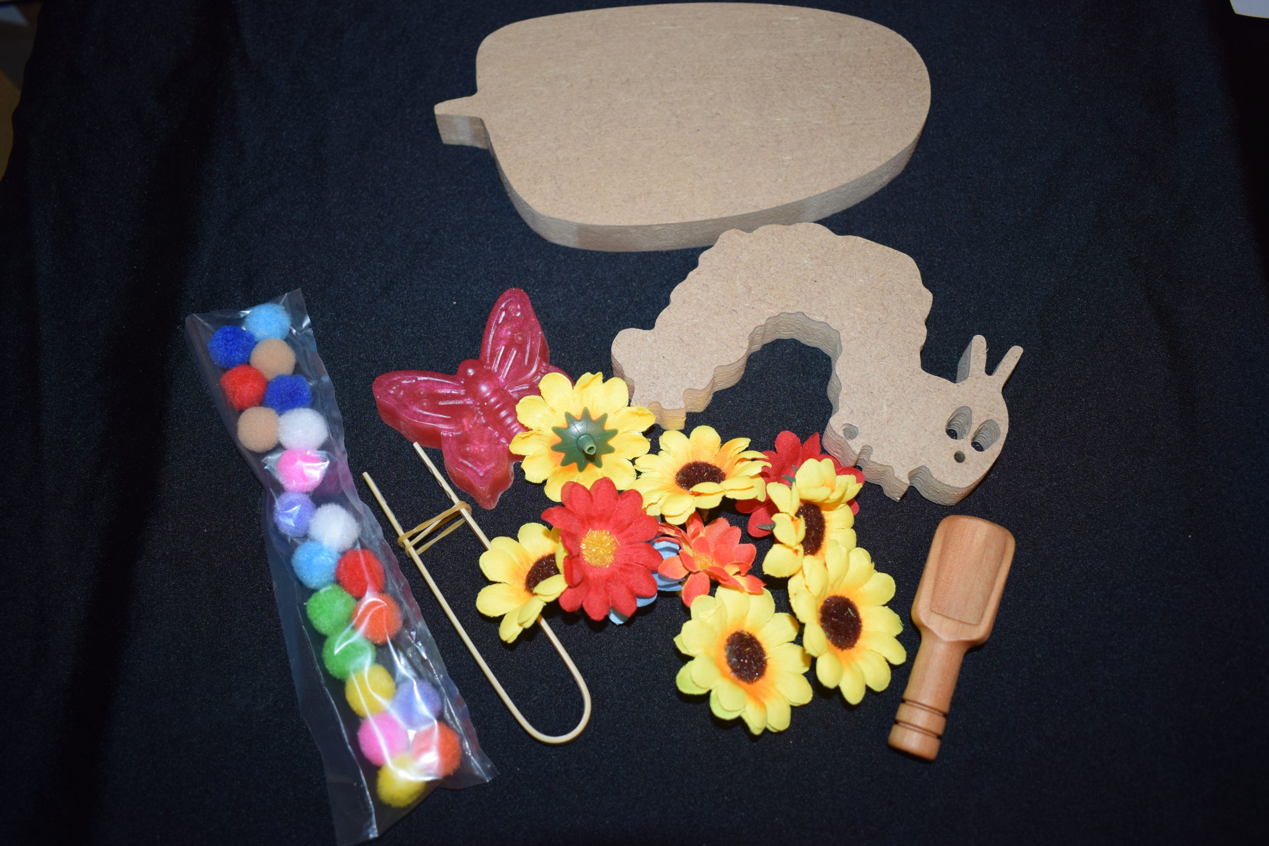 Includes MDF Caterpillar, MDF Cocoon, Resin Butterfly, scoop, tongs, flower heads, Pom-Poms Resin butterfly 6.8cm across x 6cm tall