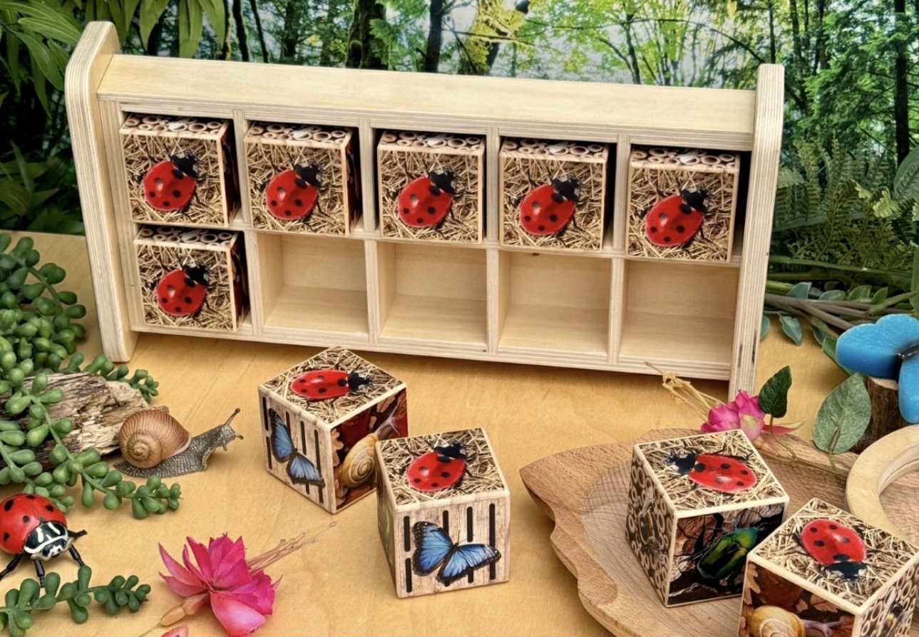 Set contains one Bug Hotel 10-Frame with ten solid pine bug cubes.